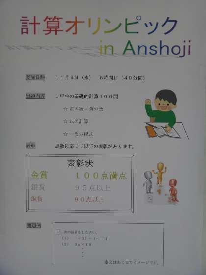 11月9日(水)に全学年が1年生レベルの計算問題を100問解きます。成績優秀者には表彰も行われます(金賞…100点 銀賞…95点以上 銅賞…90点以上)。一番いい色の賞が取れるように計算練習をして、本番に挑みましょう!!