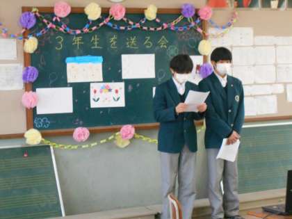 オンラインで3年生を送る会を行いました。飾りつけや1年生・2年生の一人一人が感謝や贈る言葉などのメッセージを書いた紙を持った姿を順にスライドで流したり,記念のしおりや招待状を渡しました。最後に各クラスのくす玉を割りました。心温まる会になりました。