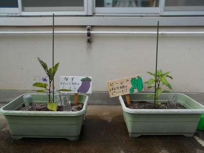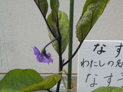 4組が栽培しているナスの『なす子』と『ピーすけ』の花が咲きました。ゴールデンウィーク前に植えた小さな苗がすくすく育って,初めて花を咲かせました。もっともっと多きく育って実を実らせるのが待ち遠しいです。