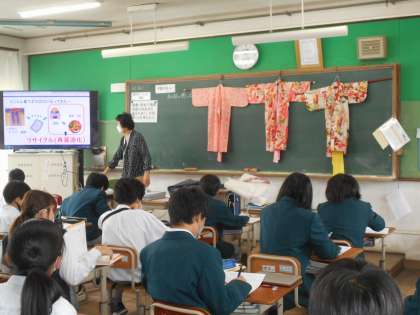 1年生の家庭科の授業では,「和服の文化」について,実物を前に,興味をもって学習に取り組んでいました。
