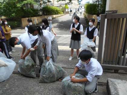 クリーンアップキャンペーンでは,校内と校外の清掃場所をクラスごとに分担しました。校内では,校舎内の廊下や階段の壁磨きやグラウンドの草抜きなどに取り組みました。校外では,山科中央公園に行って草抜きや石拾い,周辺道路の清掃活動を行い,たくさんのゴミを集めることができました。