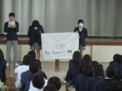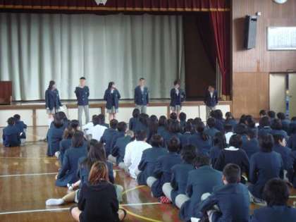 各クラスの新学級委員長がみんなの前に立ち、2年生の新しい学級目標が発表されました。新しい学級目標は、前回の3S(Start・Study・Smile)に新たにもうひとつのS(Support)が加わり、「3S+Support=4S」となりました。先日の生徒会本部役員選挙など、これからの安祥寺中学校は2年生が核となっていきます。1人だけでは小さなパワーで、うまくいかないことがありますが、2年生の一人ひとりが支え合い、つながり合うことで予想以上のパワーを発揮して、大成功となることがあります。新しい学年目標がただの目標で終わることのないように、数多くの大成功を期待しています。