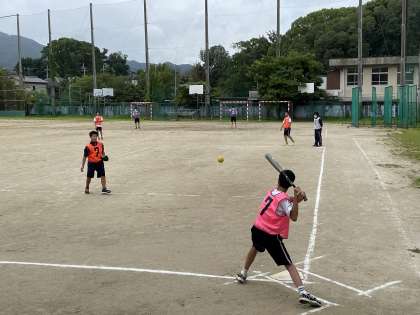 2年生保健体育科男子の授業はソフトボールです。飛んで来るボールをバットで打つのは難しいですが、ゲーム形式を楽しみながら技能の上達を目指します。