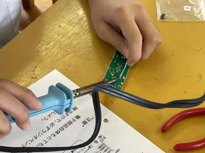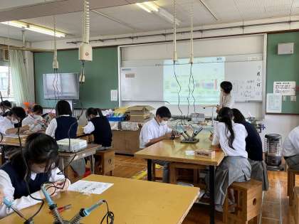 2年生の技術の授業では、「チューブライト」を組み立てます。今日は、部品のはんだ付けを行いました。とても繊細で正確さが必要な作業に、集中して取り組みました。
