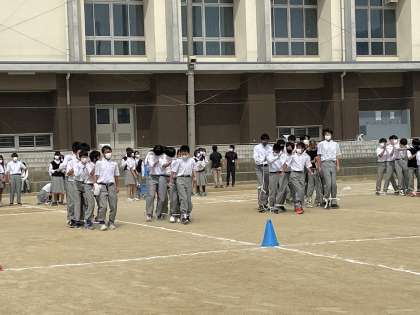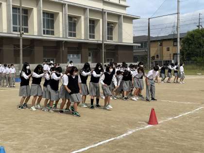 各色3学年の生徒が混じった6人1組のムカデ、3組によるリレー。「1・2、1・2」「左・右、左・右」声を掛けながらみんなの気持ちや呼吸を合わせて、うまく前に進めるようになってきました。