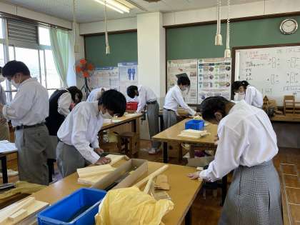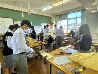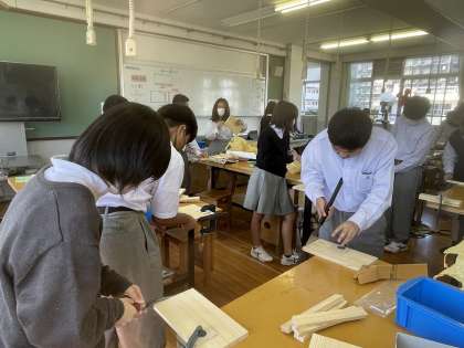 1年生の技術・家庭科(技術分野)の授業では、木材加工をしています。「本立て」か「CDラック」を制作します。切ったり、削ったり、磨いたり、使い慣れないさまざまな道具を使って一生懸命作業に取り組んでいます。