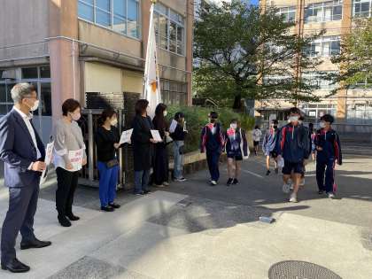 PTA役員の保護者の方によるあいさつ運動で、生徒たちに体育大会への激励をしていただきました。
