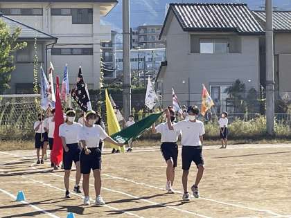 生徒会本部、各色の団長を先頭に、元気な入場行進で体育大会が始まりました。