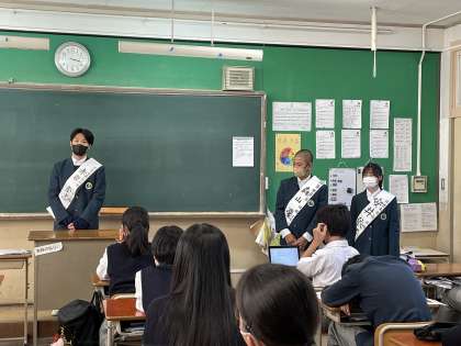 次期生徒会役員に立候補した候補者達が終学活に各クラスを回る選挙活動が、本日も行われました。昨日回らなかったグループを含め、今日も3つのグループが各クラスを回りました。
