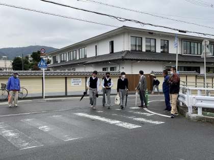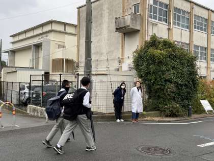 毎月1日は安全の日。朝の登校時間に学校近くの路上に教職員が立って、登校指導を行いました。