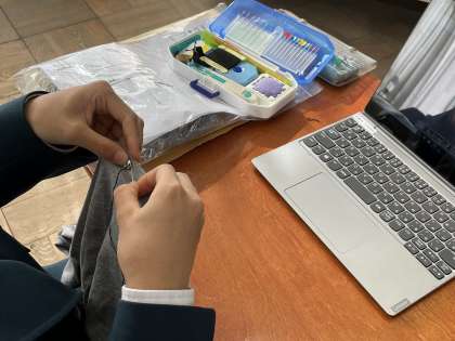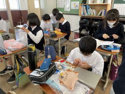 1年生の家庭科の授業では、着なくなったTシャツを使ってエコバッグを作ります。本時は、スナップ付けとボタン付けを行いました。細かい作業に悪戦苦闘しながらも、だんだんバッグの形になっていくことに喜びを感じながら作業を進めていました。