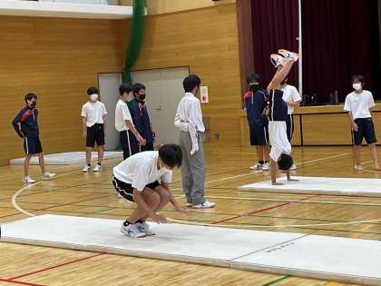 1年生の保健体育の授業では、男子はマット運動をしています。「倒立前転」や「倒立ブリッジ」などの難しい技にチャレンジしていました。(写真上)