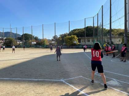 女子は、ソフトボールに取り組んでいます。初めてグローブやバットを使う生徒も多い中で、ゲームを楽しめるようになってきました。(写真下)