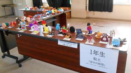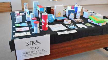 授業の中で制作した作品を展示しています。1年生は「安中の妖怪」、2年生は「空想画」、3年生は「お菓子のパッケージデザイン」です。