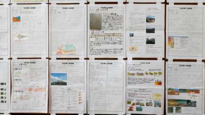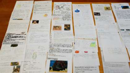 1〜3年全学年とも夏休みのレポートを展示しています。