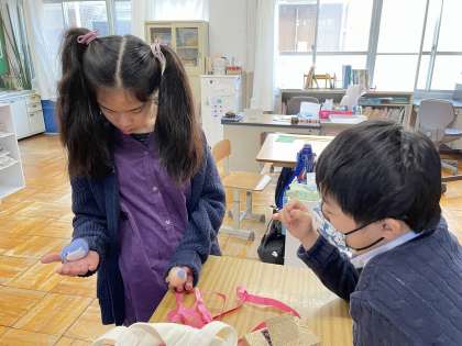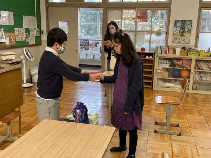 校内を案内した後、「終わりのことば」をしっかり言って、安祥寺中学校に来ていただいたお礼に、羊毛フェルトを使って作ったマスコットをプレゼントしました。最後に撮った記念写真には、2人の笑顔があふれていました。