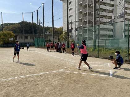 3年生の女子の保健体育の授業では、ソフトボールのゲームに大いに盛り上がっていました。(写真下)