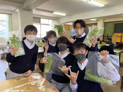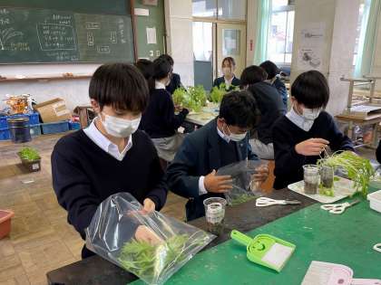 2年生の技術の授業で栽培している水菜を収穫しました。