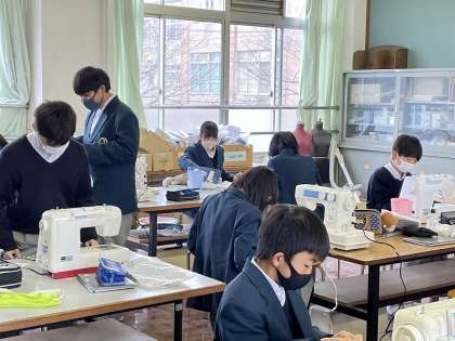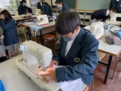 1年生の家庭科の授業では、着なくなったTシャツを使ってエコバッグを制作しています。本時は、ミシンを使ってバッグの底の部分を縫いました。完成はもうすぐです。着られなくなったTシャツがバッグに生まれ変わることに、改めて感動を覚えながら作業を進めていました。