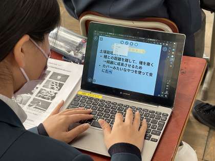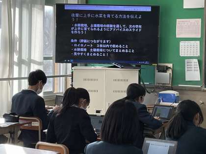2年生では、栽培していた水菜を11月に収穫しました。本時は、水菜の水耕栽培、土壌栽培の経験を通して、次の学年が上手に育てられるように、アドバイスのスライドを作りました。