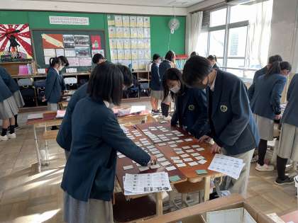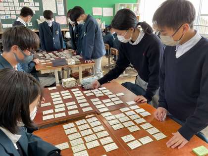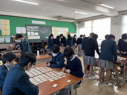 2年生では、年末から国語の授業で百人い首に取り組んでいましたが、今日は「百人一首大会」を各クラスで行いました。太鼓の合図で、廊下から学年の教員が大きな声で歌を読むと、各クラスから「ハイ!」と元気な札をとる声が聞こえてきました。新年から、クラスの仲間との絆を深める楽しい取組になりました。