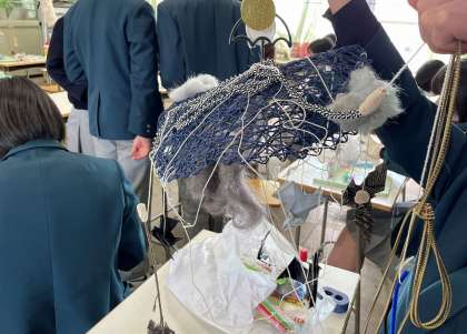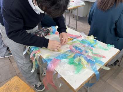 2年生の美術の授業では、「モビールの制作」に取り組んでいます。紙、木、布、針金、段ボール、セロファン、紙粘土・・・・etc、様々な材料を使ってオリジナルの作品を創り上げていきます。