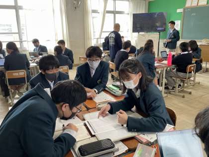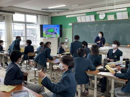 1年生の英語の授業では、「単語を楽しく覚えるゲーム」をグループ対抗で行いました。問題がテレビ画面に出題されると、回答者が積極的に手を挙げて答えを発表し、それを皆が称え、大変盛り上がる楽しい授業となりました。(写真下)