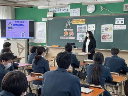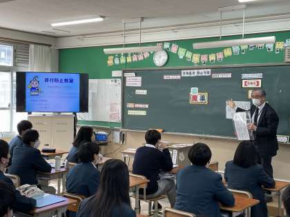 京都府警OBのスクールサポーターの方を講師にお迎えし、「薬物乱用防止教室」をクラス毎に行いました。薬物の怖さについてのお話を真剣な表情で聴く生徒の姿がとても印象的でした。