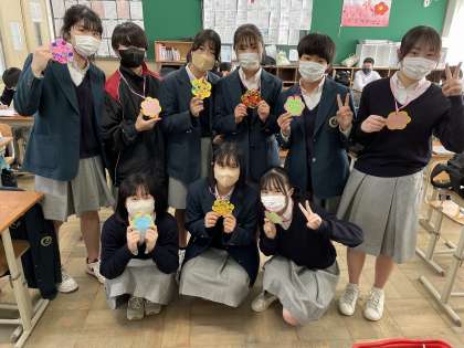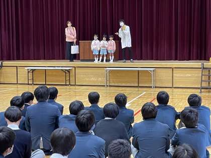 3年生の家庭科で、12月に地域の幼稚園に通う園児さんにクリスマスの贈り物とカードの制作して贈りました。今日は、そのお返しを園児さんが安祥寺中学校に届けに来てくれました。体育館で卒業式の練習をしているところへの可愛いプレゼンターの突然の登場にみんな大興奮。