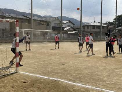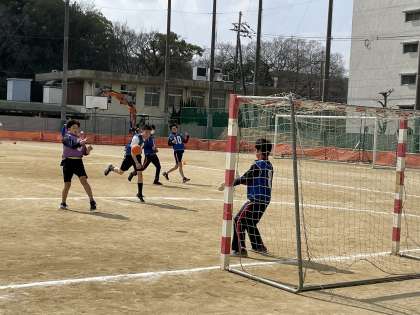 卒業前行事として、3年生は球技大会を行いました。男子はグランドでハンドボールをしました。動くと汗ばむぐらいの陽気の中、白熱した試合が繰り広げられました。