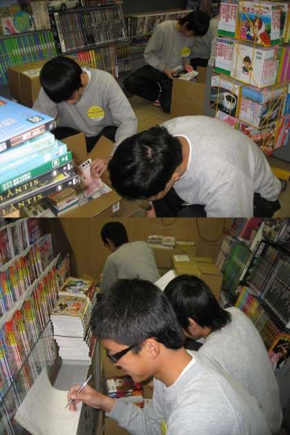山科下:山科書店、本の整理とチェックをしています。けっこう力仕事です。