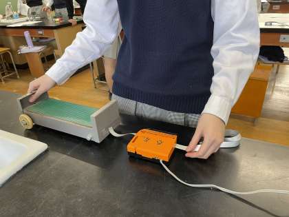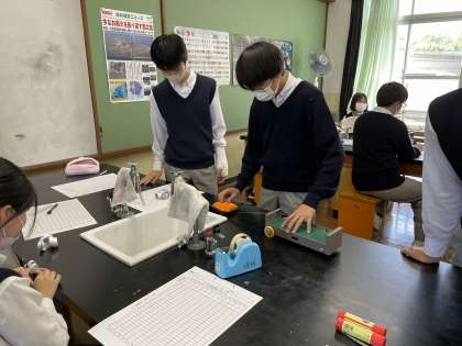 3年生の理科の授業では、力が働いていない時の運動のようすについて調べる実験をしました。力学台車と記録タイマーを使って、テープに動いた距離を記録していきます。班で協力して実験に取り組み、「等速直線運動」について理解しました。