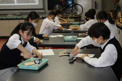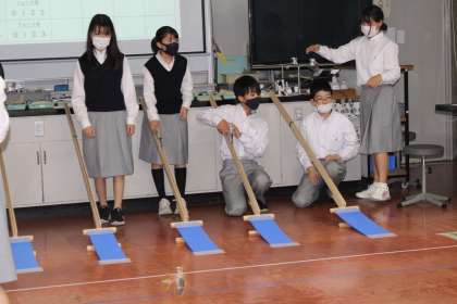 2組は、「こいで走って乗らずに発見!自転車の科学」というテーマで、より快適に自転車に乗るために、タイヤのゴムの役割や1速と6速のちがい、より遠くまでいく自転車について実験しました。