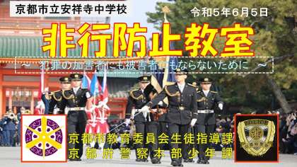 京都府警の現役の警察官の方を講師にお迎えし、保護者の方も参観していただく中で体育館で行いました。「暴力」や「万引き」「いじめ」「ケータイのトラブル」等についてお話をしていただき、生徒たちは真剣に話を聴いていました。