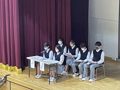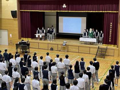 6月9日(金)6限,生徒総会が行われました。「生徒総会とは、生徒会の一員であるみなさんが良い学校を作るために、一人一人が意見を出し合う年に一度の会議です。そのためにはしっかり話し合うに参加することが大切です。人任せにせず、しっかり参加していきましょう。」という生徒会長の言葉で始まりました。校歌斉唱に続き、創立50周年記念応援ソング『step by step』を全校生徒で歌いました。