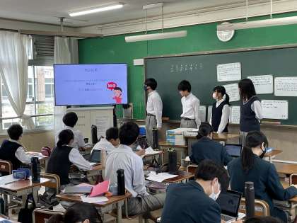 2年生の国語の授業では、「クマゼミ増加の原因を探る」という教材について、パワーポイントのスライドにまとめたものを使っての発表会を行いました。(写真上)