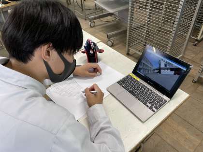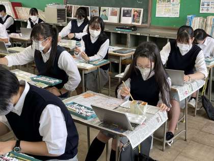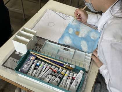 3年生の美術の授業では、自分の好きな学校の風景を写真で撮影し、それを見ながら作品を描いています。生徒一人一人の個性や学校への思いがつまった作品の完成が楽しみです。