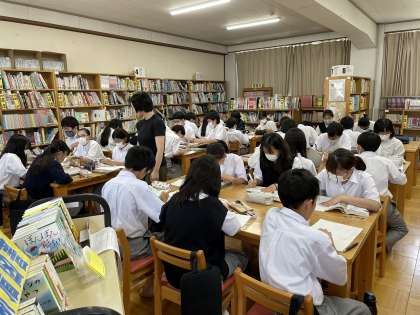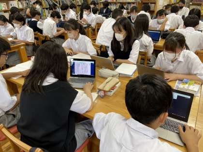 1年生の国語科の授業で、図書室で調べ学習を行いました。「俳句」の「季語」について書籍で調べた後、GIGA端末のロイロノートを使って学習を進めました。