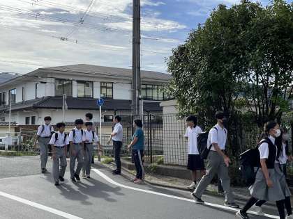 9月になりました。毎月1日は安全の日。教職員が学校近辺の道まで出て,生徒たちの登校の安全を見守ります。