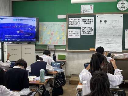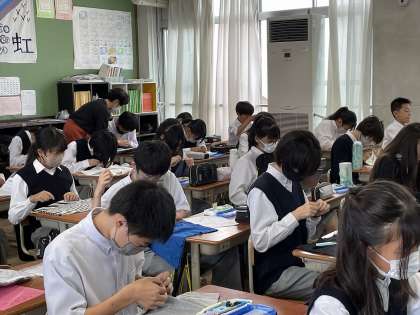 1年生の家庭科では、着なくなったTシャツをリメイクしてエコバッグを作ります。本時は、スナップを付けました。細かい作業に集中して取り組んでいました。