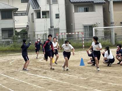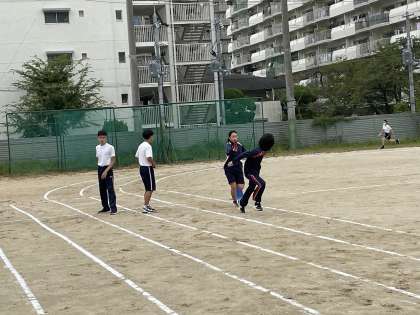 3年生は、学年競技の「全員リレー」の練習に取り組みました。バトンパスの時には、声を掛けてお互いの連携を意識して走りました。