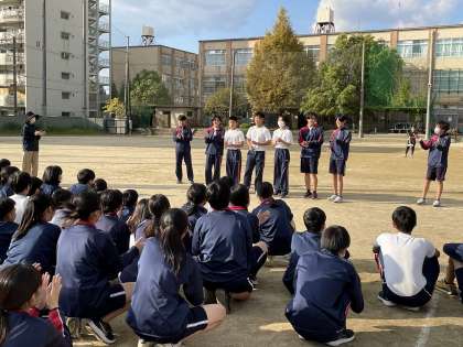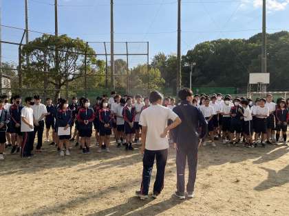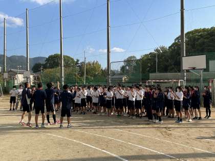 明後日にせまった体育大会に向けて、最後の色別練習を行いました。「綱引き」「台風の目」「玉入れ」の色別種目の練習の後、3年生の団長を中心に応援練習も行いました。