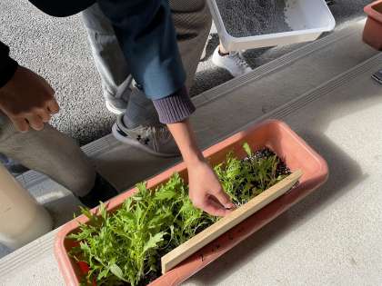 2年生が10月の初旬に植えた水菜が順調に育っています。葉の大きさを測ったり、写真を撮ったりして観察記録を付けた後、肥料をやりました。これからまだまだ大きく育つのを応援していきましょう。