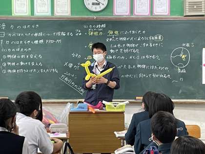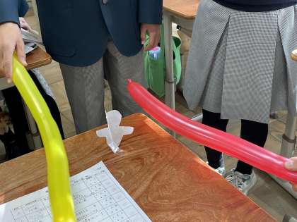 1年生の理科の授業では、いろいろな力について学習し、その中で電気の力についてスティックバルーンを使って体験しました。スティックバルーンをこすって起こる静電気が起こす様々な現象に教室内のあちこちで歓声が上がりました。