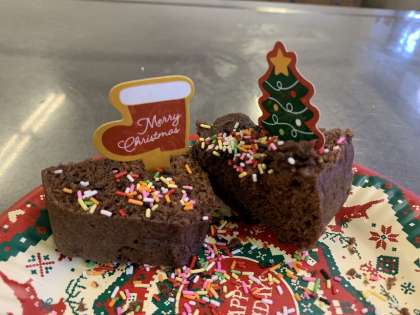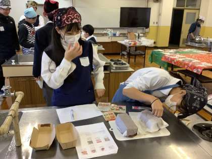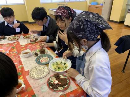 4・5組では、育成サマーキャンプや科学センターで仲良くなった音羽中学校の生徒とのクリスマス交流会を音羽中学校で行いました。調理実習では、「クリスマスの薪」をイメージしたフランスの伝統的なケーキ「ブッシュドノエル」とフランス発祥のお惣菜ケーキを作りました。自分たちが作った美味しいケーキを味わいながら、楽しいクリスマスの時間を過ごすことができました。