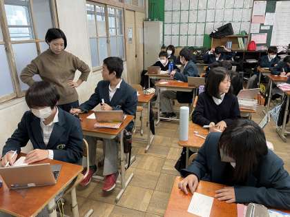 1年生の国語の授業で、年賀状の書き方について学習しました。メールやSNSの普及で郵便を利用することが少なくなってきている中で、生徒たちはとまどいながらも、お世話になった人に送る年賀状を懸命に書いていました。