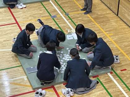 1年生VS2年生で百人一首大会を行いました。先輩と後輩がそれぞれの意地をかけて白熱した戦いになりましたが、大変盛り上がり、学年の垣根を超えた絆ができた行事となりました。