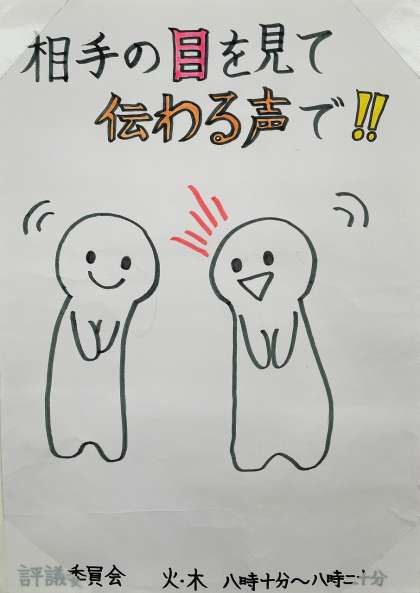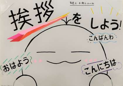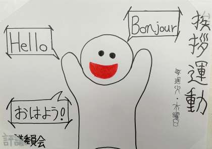 生徒会では、毎週火曜日と木曜日の朝の登校時に「あいさつ運動」を実施しています。評議会が作成したポスターが校内に掲示されています。