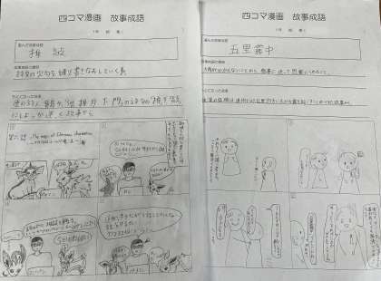 1年生の国語の授業では、「故事成語」について学習しています。生徒個人が自分の気に入った故事成語を「四コマ漫画」にして、紙ベースまたはPCで制作しました。本時は、その作品について交流会が行われました。