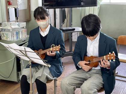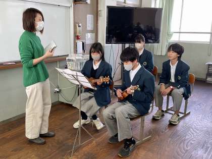 1年生の音楽の授業では、ウクレレの演奏に取り組んでいます。本時は、演奏の実技テストが行われました。